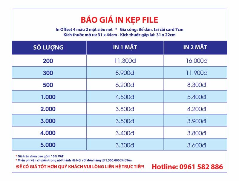 Vui lòng liên hệ trực tiếp theo số Hotline 0961.582.886 - 0964.582.886 để được báo giá in kẹp file tốt nhất